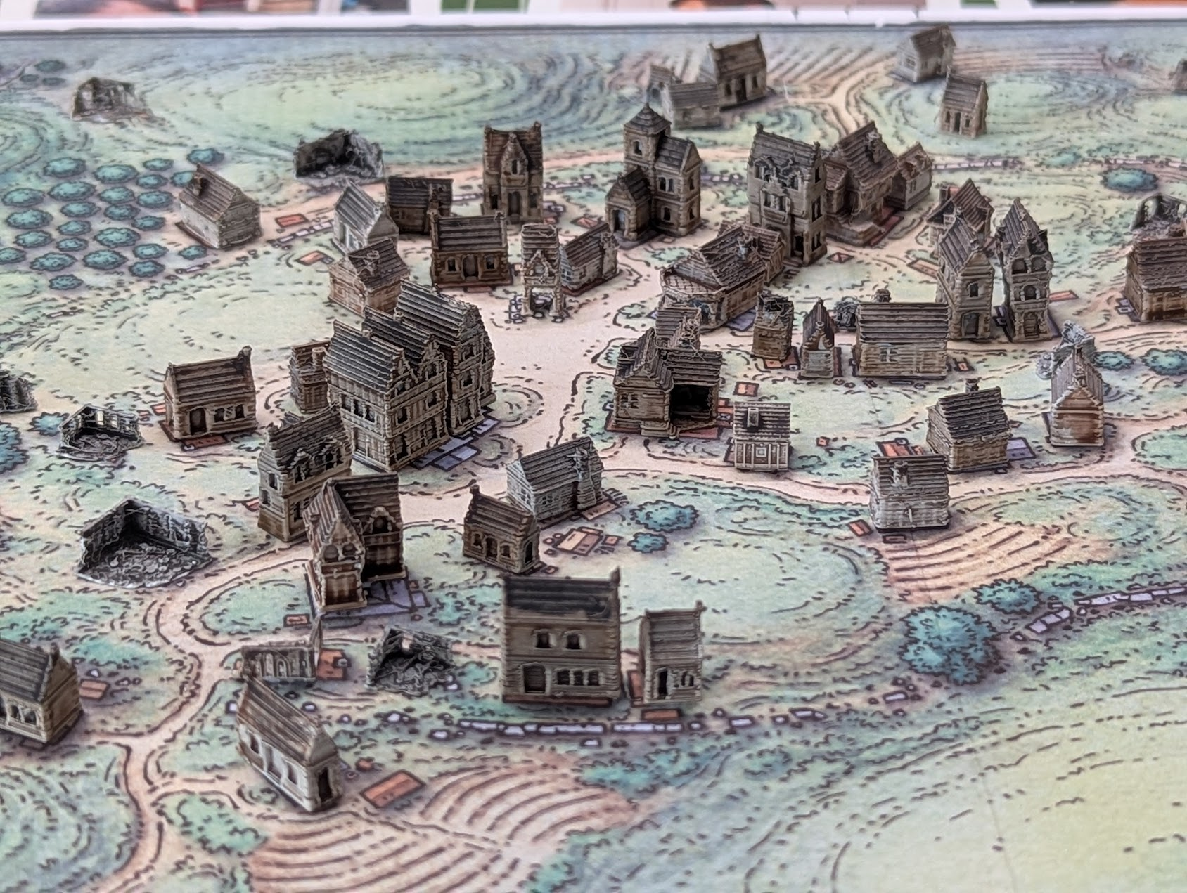 This consisted of a carefully pritstick’d twin A4 map and a pile of various printed fantasy / medieval style houses and ruins to form most of the village as well as some very small and hard to handle ruined walls from when the settlement was more heavily defended long ago. These all got a white undercoat and then different amounts of straight and mixes of washes from both citadel and vallejo to give some variation to the colour both between each building / ruin and also between the walls and the roofs.