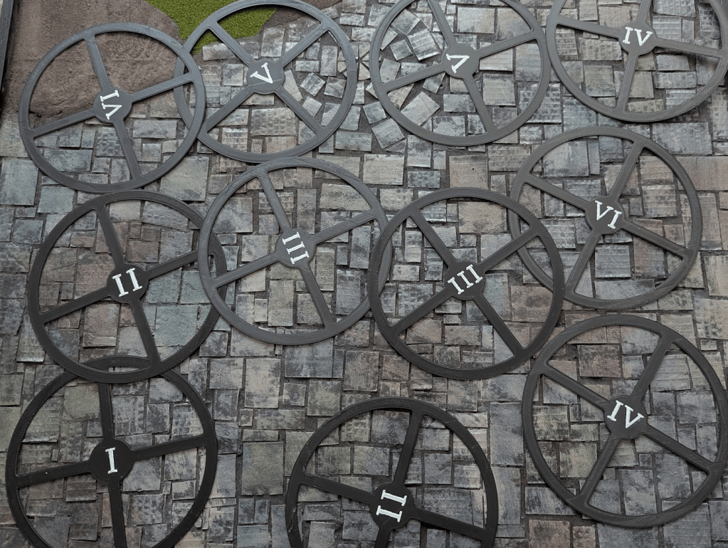 Something I started printing early after getting the FDM Creality Ender 3 were objective markers for 10th edition 40K games. I only had printed one set of 1-5 quickly for a game day some time ago but I had some spare filament after finishing a server rack project for a friend so I finally printed the 6th marker for the few missions that call for it and a second set if we meet up and play multiple games simultaneously. In standard UK fashion they are a mixed set of standards for the size with a 40mm centre that is the actual objective and then a radius of 3″ to the outer edge which is the ‘control’ zone.