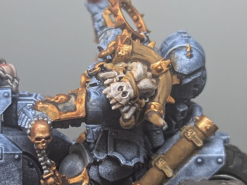 I have been periodically adding 3D printed parts from GreyTide Studios set called ‘Primal Hounds’. For the Chaplin I resisted the temptation to heavily Wolf up the bike with my box of resin bits and instead stuck to a single Skull and Horn shoulder pad that is very similar to the much larger ones adoring the Brutalis Dreadnought which will come in a later post. Now I’ve followed the trope of ‘zoom and enhance’ on the image and unfortunately I now can’t help but see the car crash of paint that makes it up, but at a few feet tabletop distance it just about passes muster, honest!