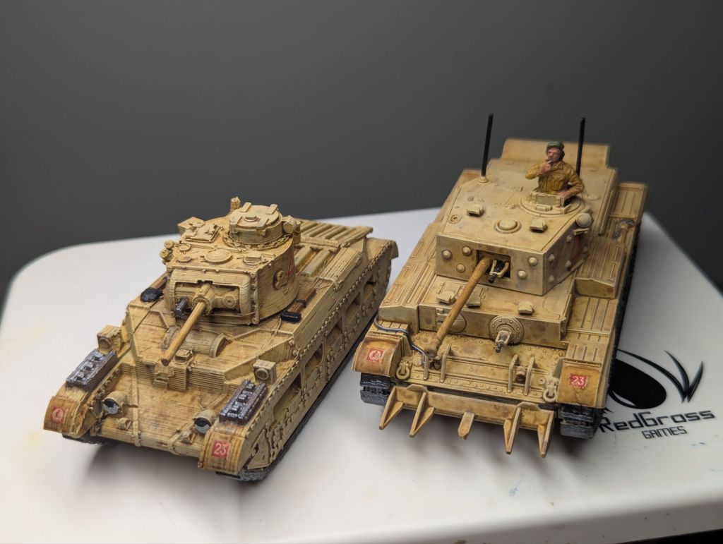 I’ve decided to paint up my WW2 collection as the 8th Army desert Rats and as such these tanks got a desert finish. This was achieved with a zenithal prime and then coats of Dark Sand from Vallejo, Sepia wash and then a dry brush of a lighter brown with Vallejo’s Iraqi Sand.